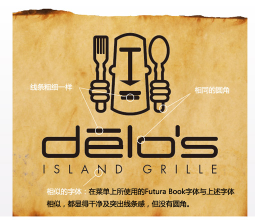 我們很喜歡DELO小島燒烤店的菜單,因?yàn)樵谖覀兊难壑兴@得很酷,它只是由黑白線條(沒有灰度)構(gòu)成,這些線條構(gòu)成了餐廳的標(biāo)志及名稱。既經(jīng)典又實(shí)惠的設(shè)計(jì)!