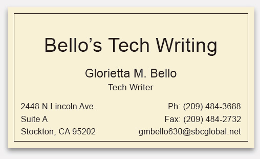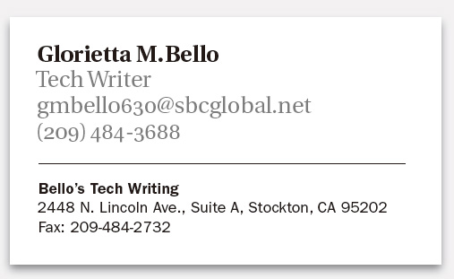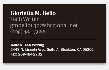 而上圖,同樣的信息,卻是經(jīng)過設(shè)計(jì)的。自信的名字及職務(wù)在白色的卡片上左對齊,突出了Glorietta本人,而不是那個(gè)了無生氣的企業(yè)名稱,并且該老兄是一名科技作家,有意識(shí)的排版突出了“寫作”這一抽象意義。較大的文字自動(dòng)傳達(dá)有效的信息溝通。通過對比(大/小,襯線體,非襯線體)形成有組織、有目的的構(gòu)成,傳達(dá)出一種簡樸的風(fēng)格,但并不乏味。如果還想更引人注目,可以象下面一樣更換一下顏色區(qū)域: