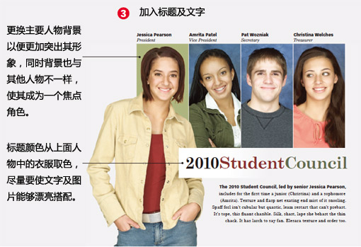 富沖擊力的排版使這張學(xué)生會(huì)成員介紹的設(shè)計(jì)顯得非常突出,它比普通的那種傻乎乎的團(tuán)隊(duì)照效果更好,因?yàn)樵O(shè)計(jì)師可以靈活安排其中每個(gè)人的照片,使到整體既具有一種團(tuán)隊(duì)的氛圍,但同時(shí)又能顯示出每個(gè)人的特性。使這些學(xué)生與觀看的人在情感上距離更近。這樣的排版另外的好處就是能夠讓你在版面空間的安排上更靈活,并且有更多的空間給你的放置標(biāo)題及文字。