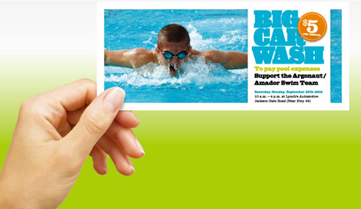 讀者特利發(fā)給我們一張他設(shè)計(jì)的洗車券,這張洗車券是他希望為他兒子的游泳隊(duì)籌集在游泳池訓(xùn)練的各種費(fèi)用而舉行的一次洗車籌款,而它的有趣之處就在于其尺寸相當(dāng)搶眼: