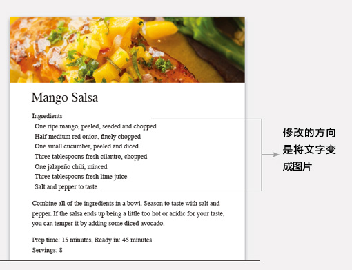 你如何設(shè)計(jì)一張與烹飪配方相關(guān)的宣傳卡片?不要將那些用料簡單地用文字列出,顯示它們!這個(gè)方式適用于任何指引性的設(shè)計(jì)項(xiàng)目。