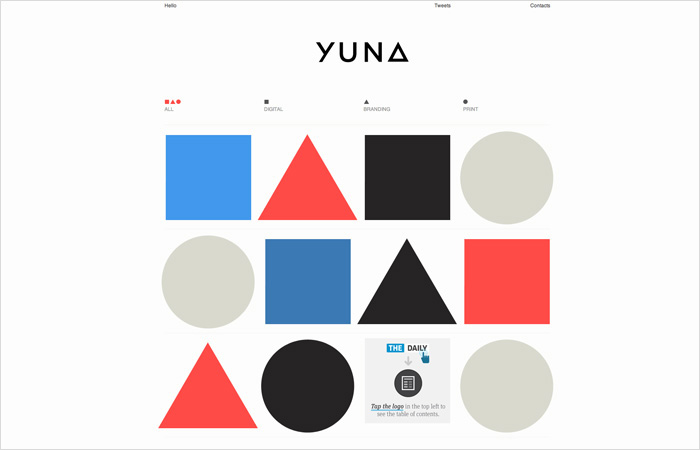圖形化為中心的個人網(wǎng)站,由于信息不多,大膽的采用了大面積留白設(shè)計,巧妙之處在于在留白的基礎(chǔ)上以圖形作為網(wǎng)站的主要特色和主旨,通透活潑而不失嚴(yán)謹(jǐn)。